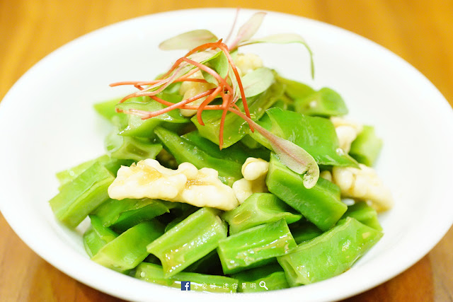 龍豆拌鮮核桃。開始還以為是秋葵,原來這叫作龍豆,清脆爽口而不膩,聽說營養價值也很高。