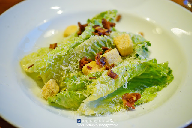 凱撒沙律。羅馬生菜新鮮爽脆,加入麵包糠,煙肉粒及芝士碎,很有水準。