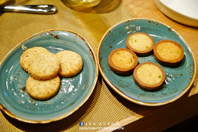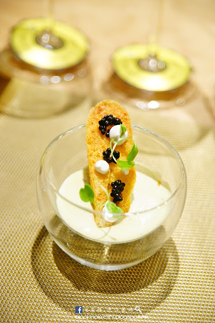 Amuse Bouche是一塊鋪了魚子醬的薄脆,底下白色的是帶有芝士味的醬,醬汁味道濃郁。Ginger marinated akami and toro tuna,用薑醃漬過的呑拿魚粒,口感綿密又鮮味,吃起上來味道清爽。