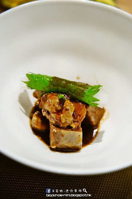 Braised short rib, porcini mushrooms, shiso and daikon salad, yuzu kosho vinaigrette。Short ribs口感很柔嫩,吃著帶有一點點膠質,而最欣賞大廚特別調製的柚子胡椒醋汁,剛好可以減低牛肉的油膩感。