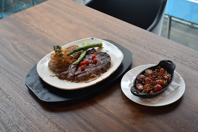 美國頂級紐約牛扒及美國頂級肉眼呈上。牛扒其實用上預熱至攝氏250度的白瓷碟盛上,所以上檯時滋滋作響而油香撲鼻,這做法能一直保持溫度,吃到最後也不會冷掉。