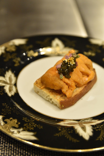 北海道海膽多士先上。大廚把北海道海膽鋪滿在烤得香脆的香草多士上,並在海膽上加上魚子醬、紫蘇食用花和金箔作點綴。賣相極美味道也一流,海膽的甘甜在口腔裡久久不散。