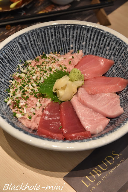 四式吞拿魚丼當中放上赤身、中拖羅、大拖羅和吞拿魚腩蓉,一口氣可以吃到幾個不同的部位,喜歡吃吞拿魚的可試試。三塊刺身都吃過是各有特色,不過比較喜歡中拖羅,因喜歡其魚油分佈平均,既有油香亦不失魚味。