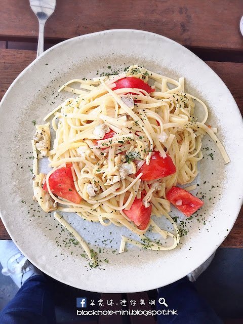 煎帶子墨魚汁意粉。店內有不少客人都選這個意粉,吃過後每個人的嘴和牙齒都黑黑的有點攪笑,不過它的味道的確不錯,難怪有這麼多人追捧。香蒜蕃茄蜆肉意粉。相比起墨魚汁意粉,這個就沒什麼特別,味道只是中規中矩,加點辣椒仔後便惹味一點。