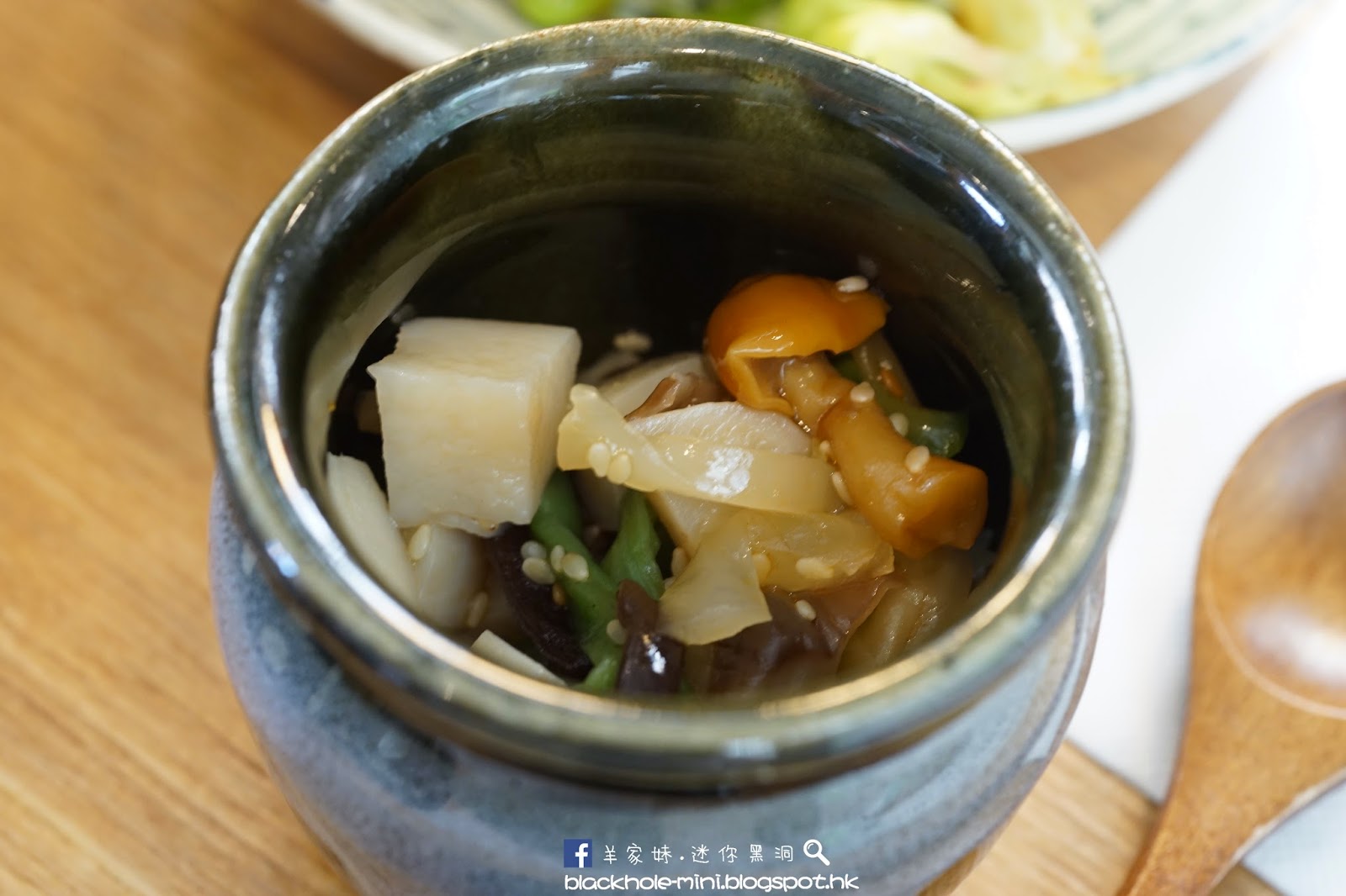 飯糰套餐NT$160,想要多一件飯糰加NT$200便可以。套餐包含自家作漬物與柚子沙拉或胡麻沙拉二選一、兩道配菜和一杯茶。