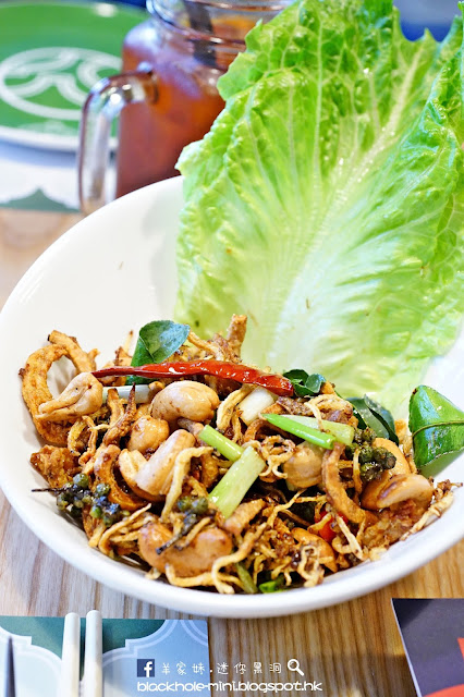 炸魚鬆配青芒果沙律。魚鬆炸得非常香脆,配上清爽酸香的青芒果,不但能減低魚鬆的熱氣感,吃起來也特別醒胃。