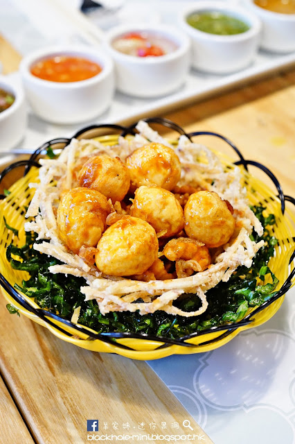 脆香腰果蝦乾魚仔。又稱為三脆,有炸檸檬葉、蝦乾和魚仔,口感酥脆富咸香,用來送酒一流。炸女婿蛋。這是傳統泰國菜,由母親初見女兒男友時為對方煮的,本來應該是用雞蛋配酸甜汁,但大廚就改用較小的鵪鶉蛋,吃的時候就更方便。