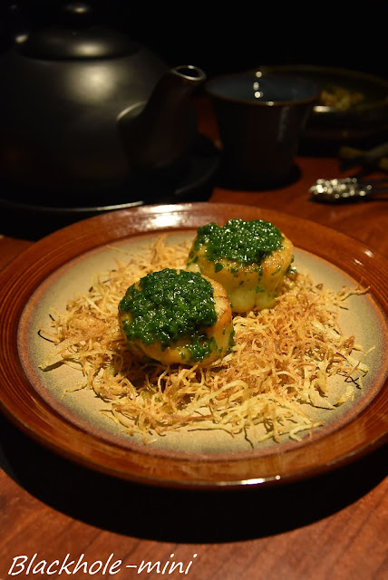跟著的是原隻北海道帶子,煎成金黃色而肉厚肥美,面層的蔥油又是融合了上海跟四川的做法,帶點花椒的麻而不辣,也沒有蓋過帶子的鮮甜。底層的炸脆薯仔絲香脆不油膩,也是惹味之選。