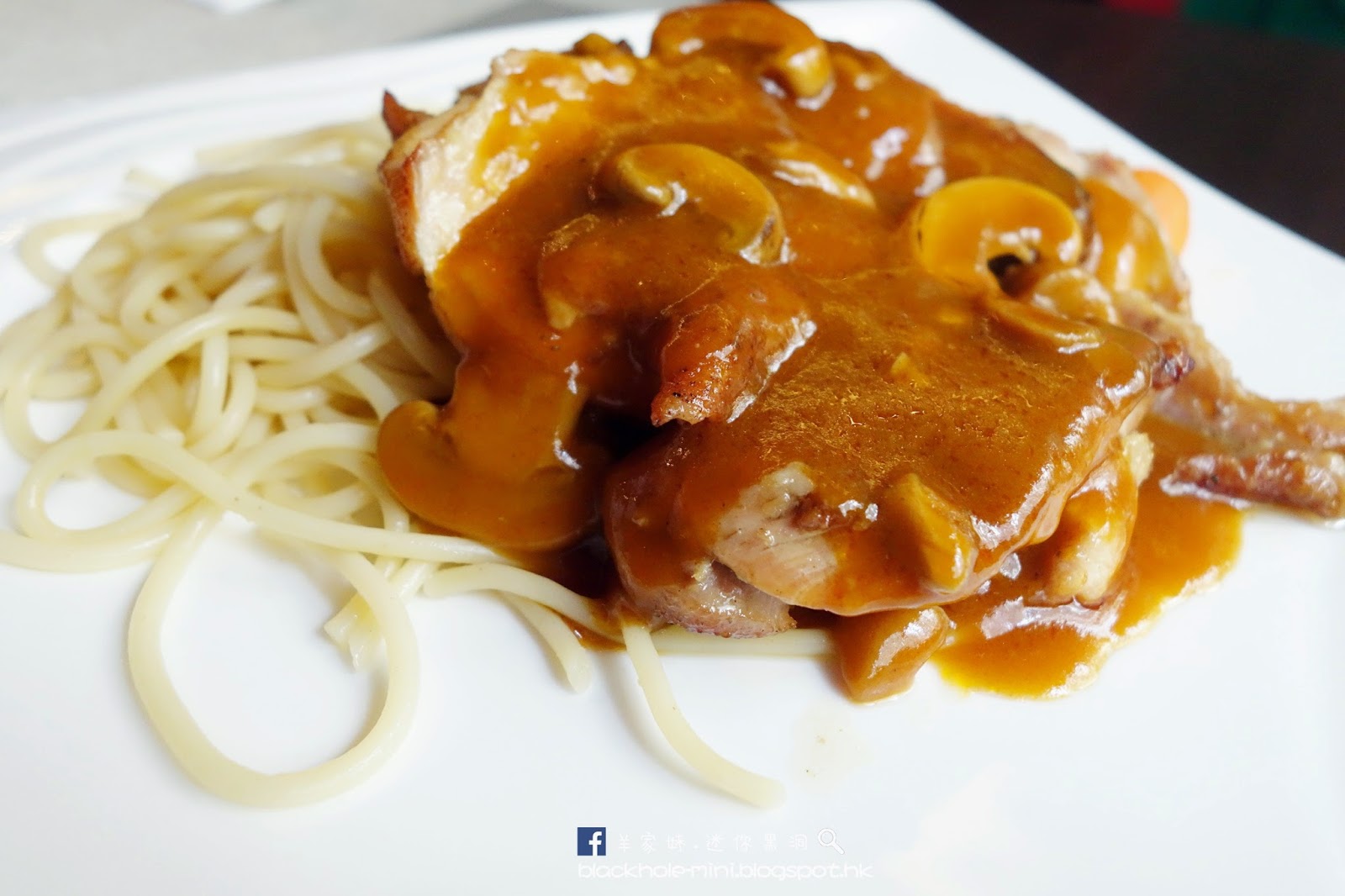 去港式西餐廳,我只會點紅湯,因大多都做得不錯,蕃茄味濃又多蔬菜,而且羅宋湯本來就是這裡的招牌菜,最後味道也沒令人失望,唯一不同的是份量比以前少,可能是午市的關係吧;相反是日忌廉湯味道偏鹹,湯裡面丁點配料都沒有,完全就是純忌廉湯。餐包換成這種包面有點粉粉的,且帶點提子味道,雖不是難吃,還是喜歡口感鬆軟的傳統餐包多一點。蘑菇雞扒配意粉。是預期之中的味道,蘑菇汁都算香濃,亦有片片蘑菇,雞扒也可以,煎出來的雞扒不會太熟,切開吃下一口也不會太嚡,坊間有地方會對雞扒之類寧嚡莫生,今天的雞扒沒這問題。