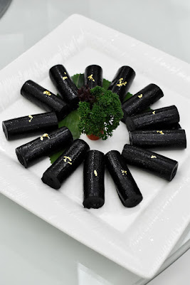 脆皮糯米雞雖是較遲出現的菜式,但大家對它的評價都很正面,雞身皮薄而脆也沒太多脂肪,內裡的糯米飯既香口又帶雞油香氣,就算是遲來的菜式大家也將它吃下肚。 甜品環節來了茶居蔗汁千層糕和黑色的金箔芝麻卷,當中比較欣賞黑中發亮的芝麻卷,因它的芝麻味夠濃。