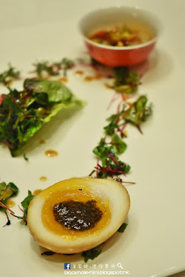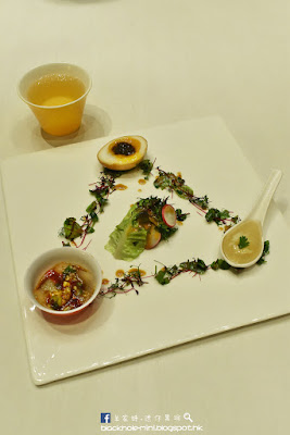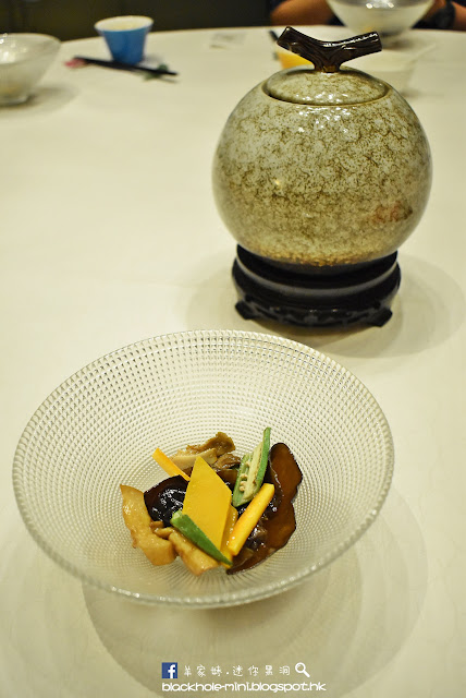 人都差不多到齊,前菜便送上由水晶蟹肉 、涼拌海參、黑松露燻蛋和中間的麻醬沙律合併而成的滬坊小碟,水晶蟹肉入口滑溜,涼拌海參的海參既脆口醋香也醒胃,黑松露燻蛋的蛋黃夠濃燻味也不錯,所以沒給黑松露的香氣比下去。