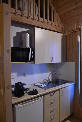 廚房設備沒有昨天的齊全只有微波爐、熱水壼、雪櫃和兩個爐頭,地方比較少也跟 dining area在一起,但基本餐具和餐檯餐桌坐椅還是有的。