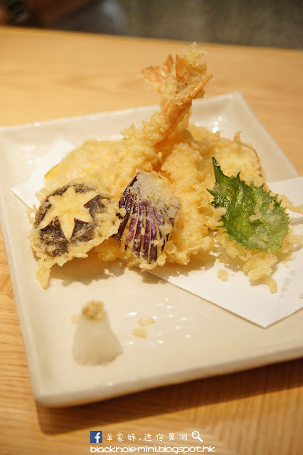 餐廳既然是用上摩登烹調手法,便來了個紅肉的澳洲和牛西冷配柑橘醬油,和牛西冷大約六七成熟,肉質入口軟熟無渣而外層香口,柑橘醬的酸甜固然能帶出肉味,但跟上的蒜片和黃芥末其實也可如實的將油香帶出來。大蝦野菜天婦羅拼盤的炸漿不錯,不會太厚而令人入口吃到一大口脆漿,且吃著大蝦其炸油也沒多少留下卻入口香脆,這個天婦羅拼盤可以encore。