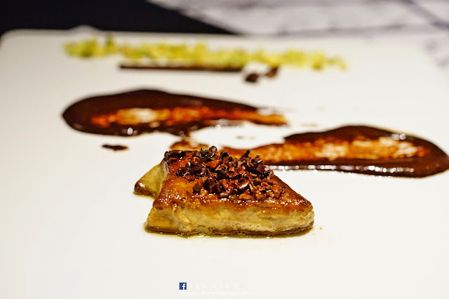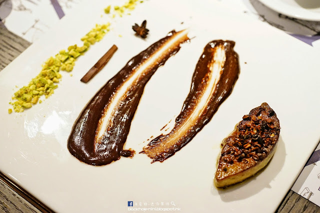 香煎鵝肝配朱古力可可豆。灑在鵝肝上的是馬達加斯加朱古力碎,味道帶點酸,可以減低鵝肝的油膩感,品嚐時加點開心果碎,口感更豐富。