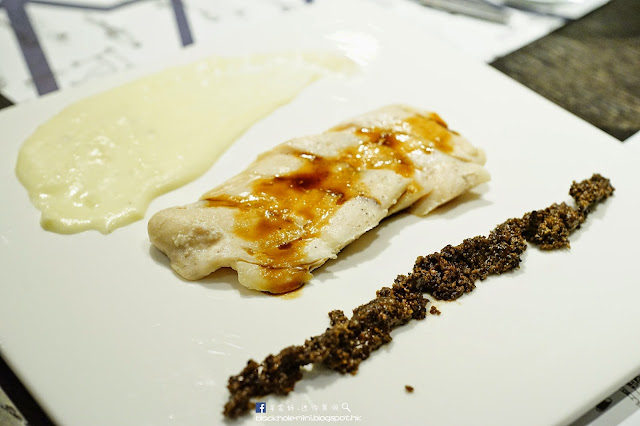 黑朱古力烤鱈魚配黑橄欖、藏紅花及醃製菠菜。魚油豐腴的鱈魚魚肉滑溜,配上濃郁的黑朱古力醬,加上墊在魚塊下的醃製菠菜,魚油雖香口但整體清爽而不油膩。