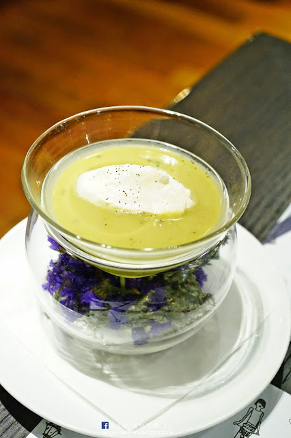 薄荷青豆蓉湯配忌廉泡沫及朱古力粉。盛湯的玻璃器皿很漂亮,底部放著紫色的小花。店家送上青豆蓉湯後灑上點朱古力粉,開動前先把帶酸香的忌廉泡沫與湯拌勻,凍湯入口味道清新,餘韻帶有少許朱古力的甘甜味。