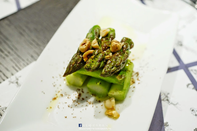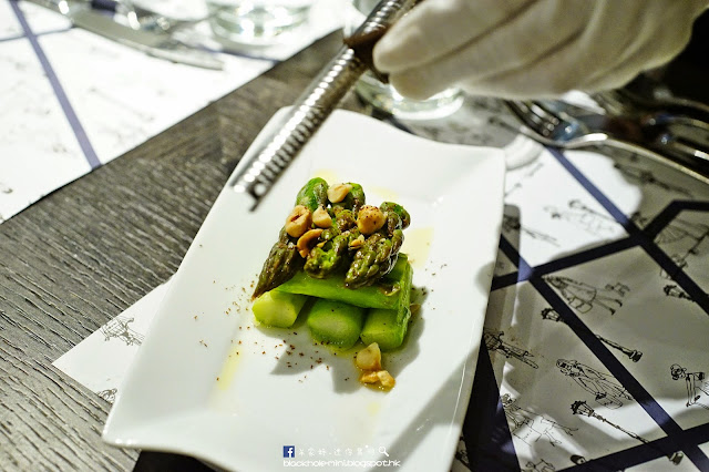 青蘆筍配榛子油醋及多明哥朱古力碎。店方呈上菜式後,即席刨下了預備好的多明哥朱古力碎,令人感覺菜式更矜貴,平和的口味與鮮嫰清爽的青蘆筍出奇地味道很搭。