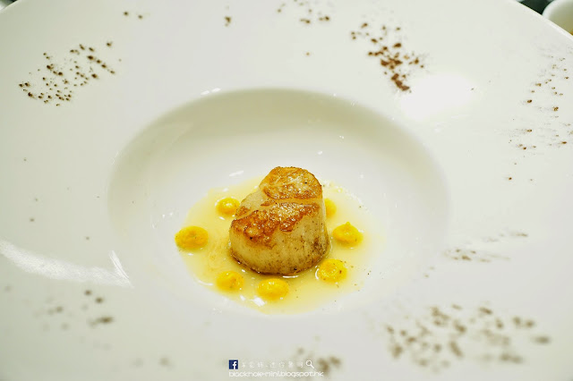 香煎帶子配朱古力牛油。帶子煎成金黃色,內裡剛好熟,佐以旁邊用白朱古力和可可油調製成的朱古力牛油,甜甜的味道提升了帶子的鮮味。