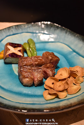 鐵板燒時間來了A5和牛西冷配季節野菜。來自宮崎的A5和牛西冷肉質軟熟只是覺得油份多了點,還好有蘿蔔蓉酸汁來中和油膩感,另外伴碟的青椒仔和南瓜片也有消膩的效果。