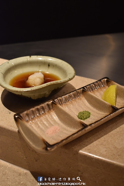 開始先品嚐翡翠果與甜蕃薯天婦羅,翡翠果就是銀杏,但日本品種在港少見。另天婦羅的脆漿極薄,只像一層外皮包著翡翠果,炸好的翡翠果只有香口而絲毫苦澀味也沒有。另甜蕃薯是先蒸熟再裹上炸漿炸好,炸成金黃色的蕃薯入口香甜,沾點喜瑪拉雅山岩鹽的話甜味更突出。吃罷見到吸油紙上幾乎沒油漬,可見師傅的功力。