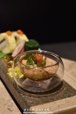 再來的是紫菜海膽配魚子醬,上年去過禮文島行山跟吃海膽,心中知道這出品有多好,也吃過不少海膽天婦羅,通常是把海膽包著紫菜裡面再炸,而這裡的是先把紫菜炸脆,再鋪上北海道海膽和魚子醬便完成,入口一冷一熱又脆又軟,口感豐富之中亦更嚐到禮文島海膽的甘甜。