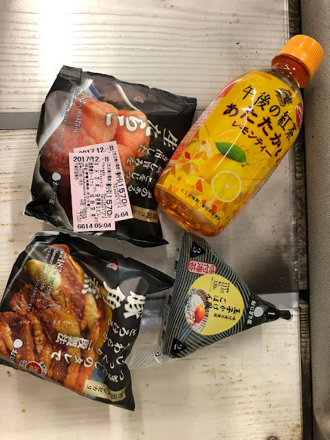 不怕死的繼續左Hong Kong Express,慶幸準時起飛也準時到達羽田機場。到達時間才早上五點,本來是打算在羽田機場租車在成田機場還車,可是在羽田取車的價錢比起在成田機場租和還貴了10,000円以上,且我們回程也在成田機場上機,反正這麼早也是取不到車,衡量過後決定由羽田去成田機場取車,也可順便在車上多睡一個多小時。出發前先到便利店買飯團和熱茶,一口氣買了三個口味,明太子醬油蛋和豚肉。 由羽田機場到成田機場最便宜是坐每位1750円的京成電鐵,大概坐了將近1小時45分鐘就到。