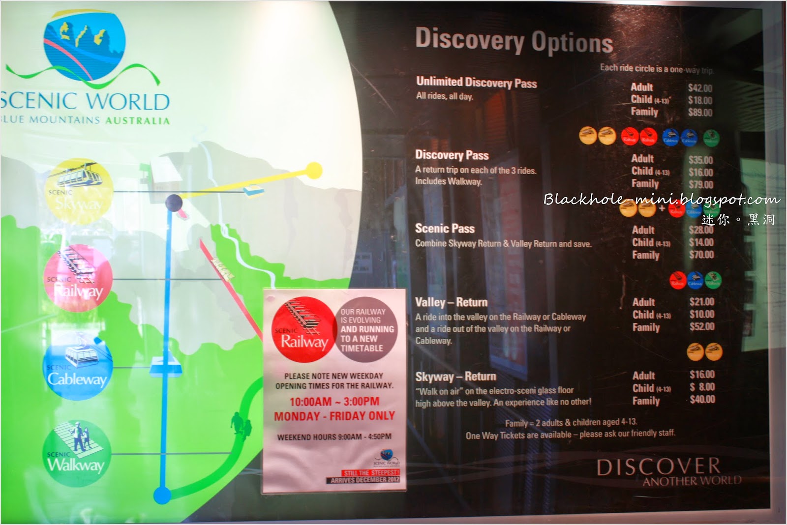 到左Scenic World先要乖乖排隊買上落山既ticket,ticket有幾種選擇,叫Discovery Options,而其實俾多$7就可以坐cableway來回,但係我地只係買左valley return $21,先搭一程54度斜既railway落山,跟住指示行十分鐘,中途有d舊礦洞同工具睇下,之後再坐返cableway上山,整個旅程就咁完左了。