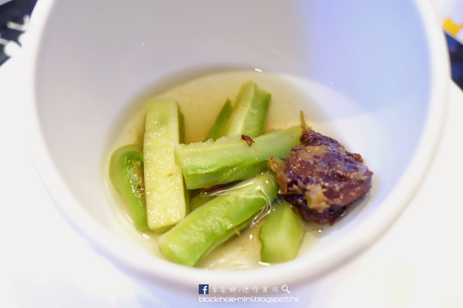 話梅苦瓜。非常清新的餐前小吃,冰涼酸甜的苦瓜條,不過餘韻的苦味很長,所以只吃了兩條。