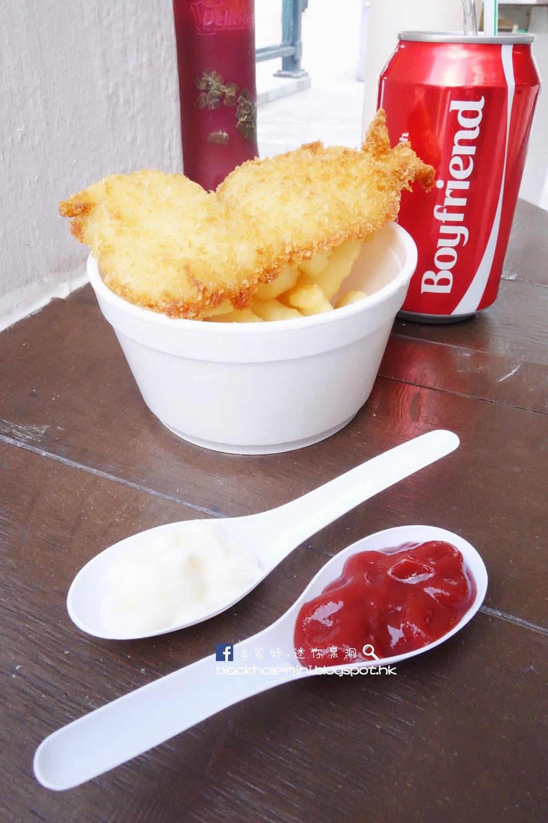 球場旁邊的店子主打Fish and Chips,不過亦有燒賣、魚蛋、雞翼等港式小吃,看起來有點靠不住的感覺,所以只點了小的炸魚薯條,另外還加了一隻炸雞脾。