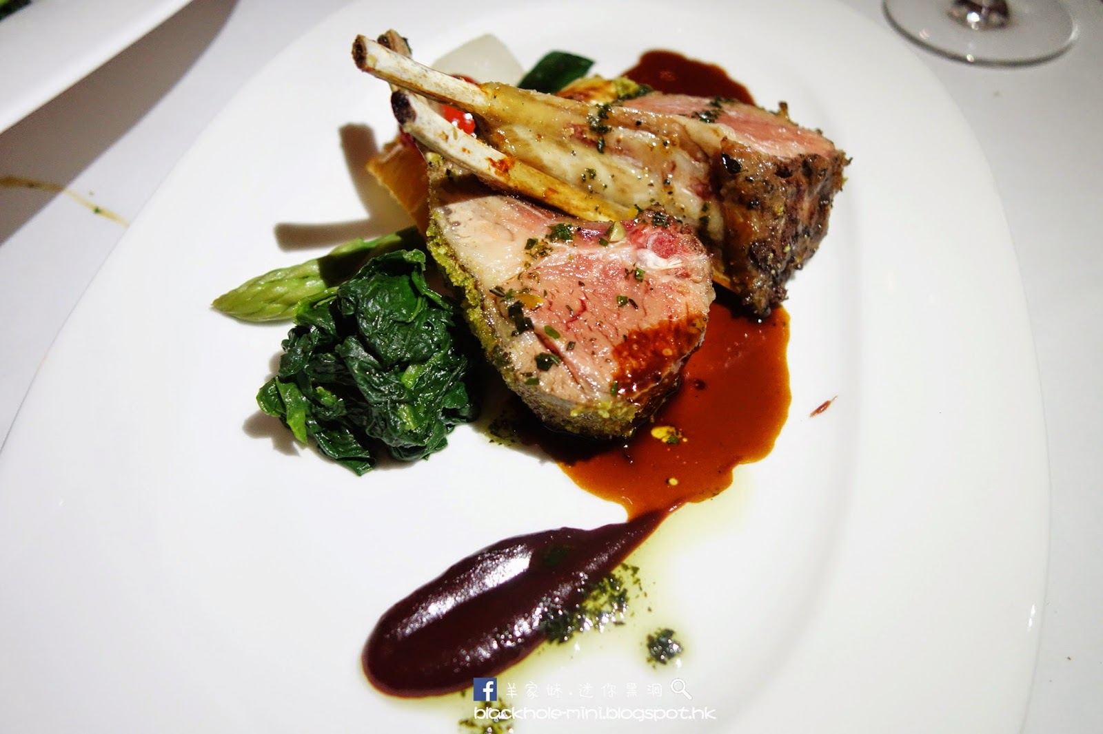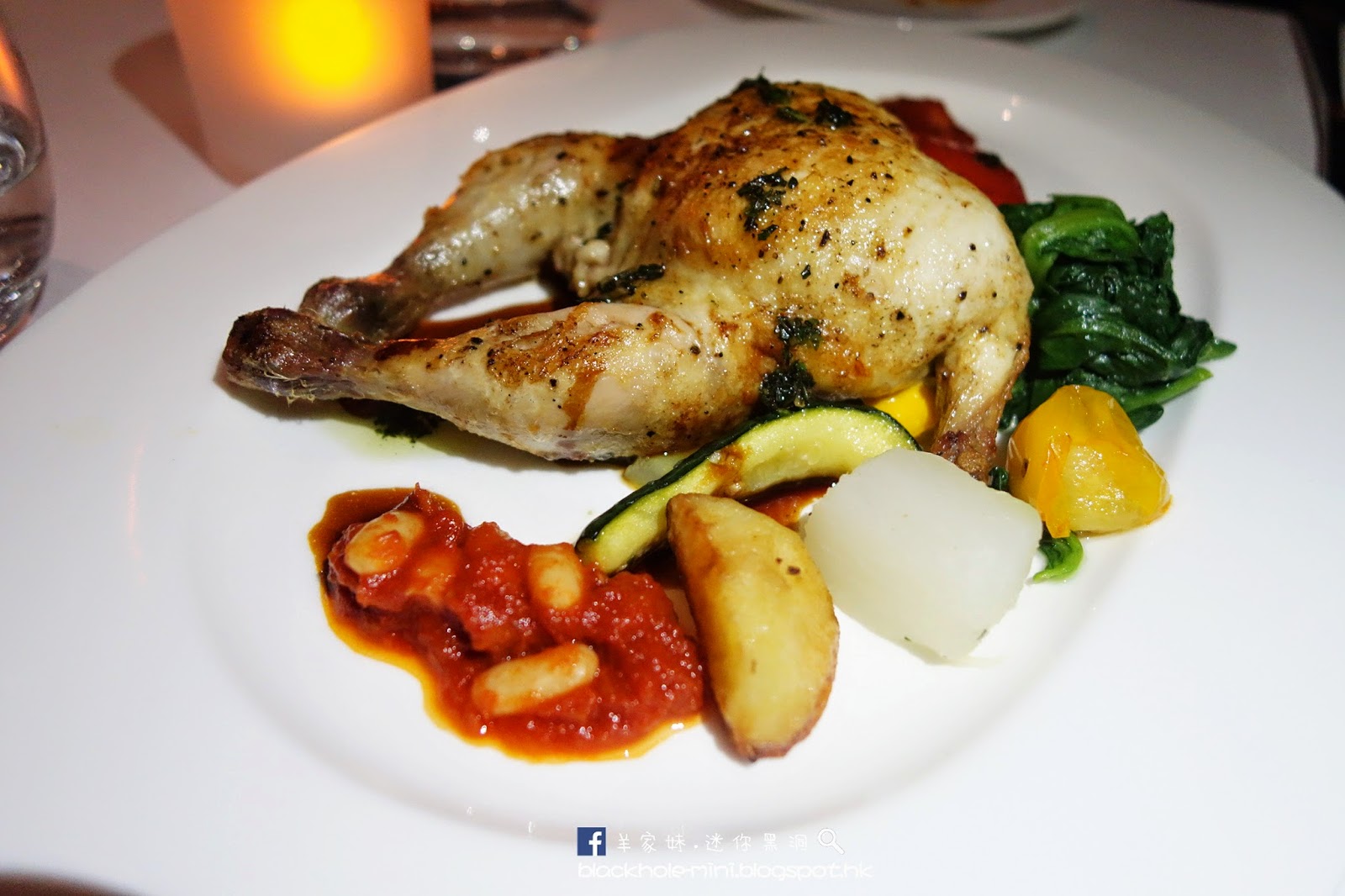 Roasted rack of lamb with herbs crust, Chianti mustard。不得不推介這裡的羊架,羊肉顏色粉嫰,吃起上來肉嫰多汁,外層包著薄薄一層香脆香草醬,不用沾薄荷啫喱已經很美味,而且羊羶味也不厲害。Pan-roasted boneless spring chicken stuffed with mozzarella and parma ham on cannellini bean stew。煎無骨春雞裡面釀入馬蘇里拉芝士和巴馬火腿,煎得頗香口,肉質也嫰滑。