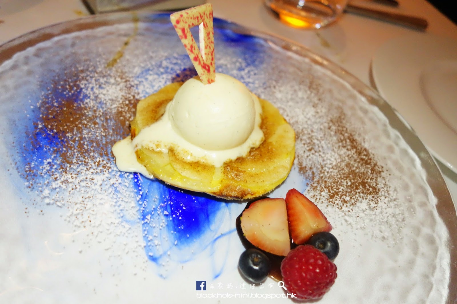Freshly baked sliced apple on filo pastry served with banillia gelato。酥皮焗得很薄很脆,面層鋪滿意大利紅蘋果薄片,口感脆上更脆,再配搭雲呢拿雪糕伴吃,相當美味。
