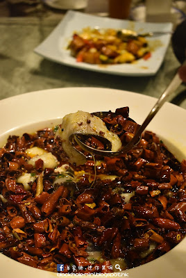水煮菜式來了水煮野生黑珍珠,這黑珍珠當然不是奶茶中那些,而是來自廣東省萬綠湖的一種天然放養叫黑珍珠的淡水魚。魚片經過麻辣湯的洗禮後,上檯不消一會已KO一盤,最後要追加一盤才夠喉。