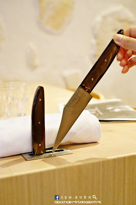 貫徹小酒館的風格,餐廳裝潢樸素溫暖,聽說佈置、餐具和桌椅都與巴黎總店有90%相似。特別值得一提是餐桌上的餐刀,是由大廚Akrame Benallal親自設計,刀形獨特,刀柄採用牛角製成,插在桌上彷效肉店內擺放肉刀的設計,非常有趣。
