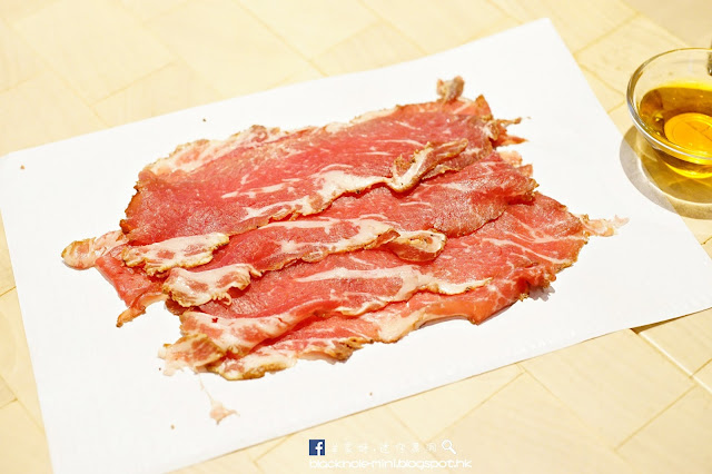 煙燻五十天熟成薄牛肉片。牛肉來自荷蘭,風乾五十天然後再煙燻,可先吃一片原味,口感柔軟,鹹香適中。第二片記得要沾點Akrame的自家黑胡椒味橄欖油,香味獨特,味道層次更豐富,另外伴麵包或其他肉類也很適合。
