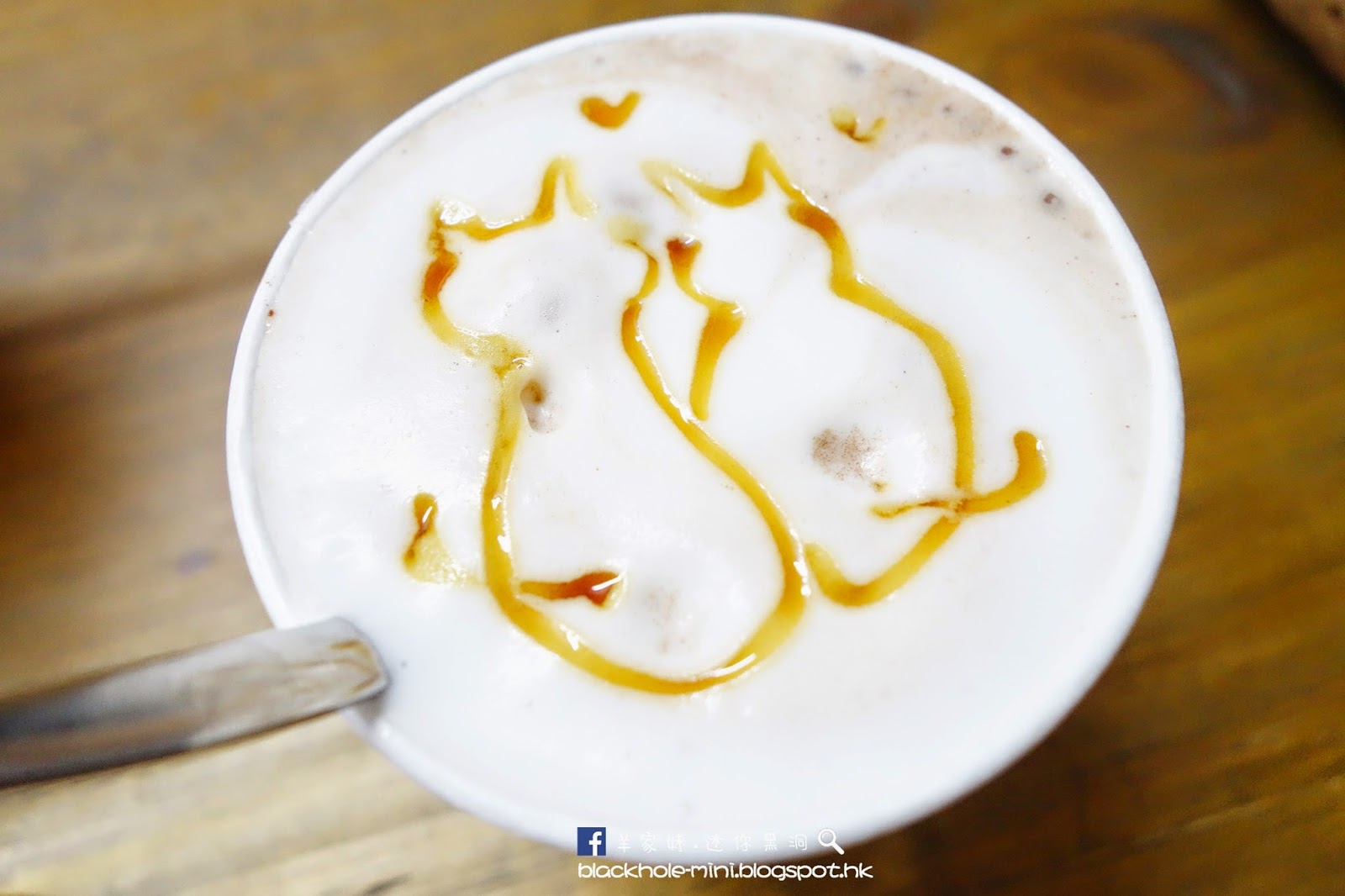 特濃朱古力。看到是用超市買得到那罐紫色吉百利朱古力粉去沖的,都算濃郁,泡沫上面用焦糖畫了兩隻貓咪的背影,挺可愛。
