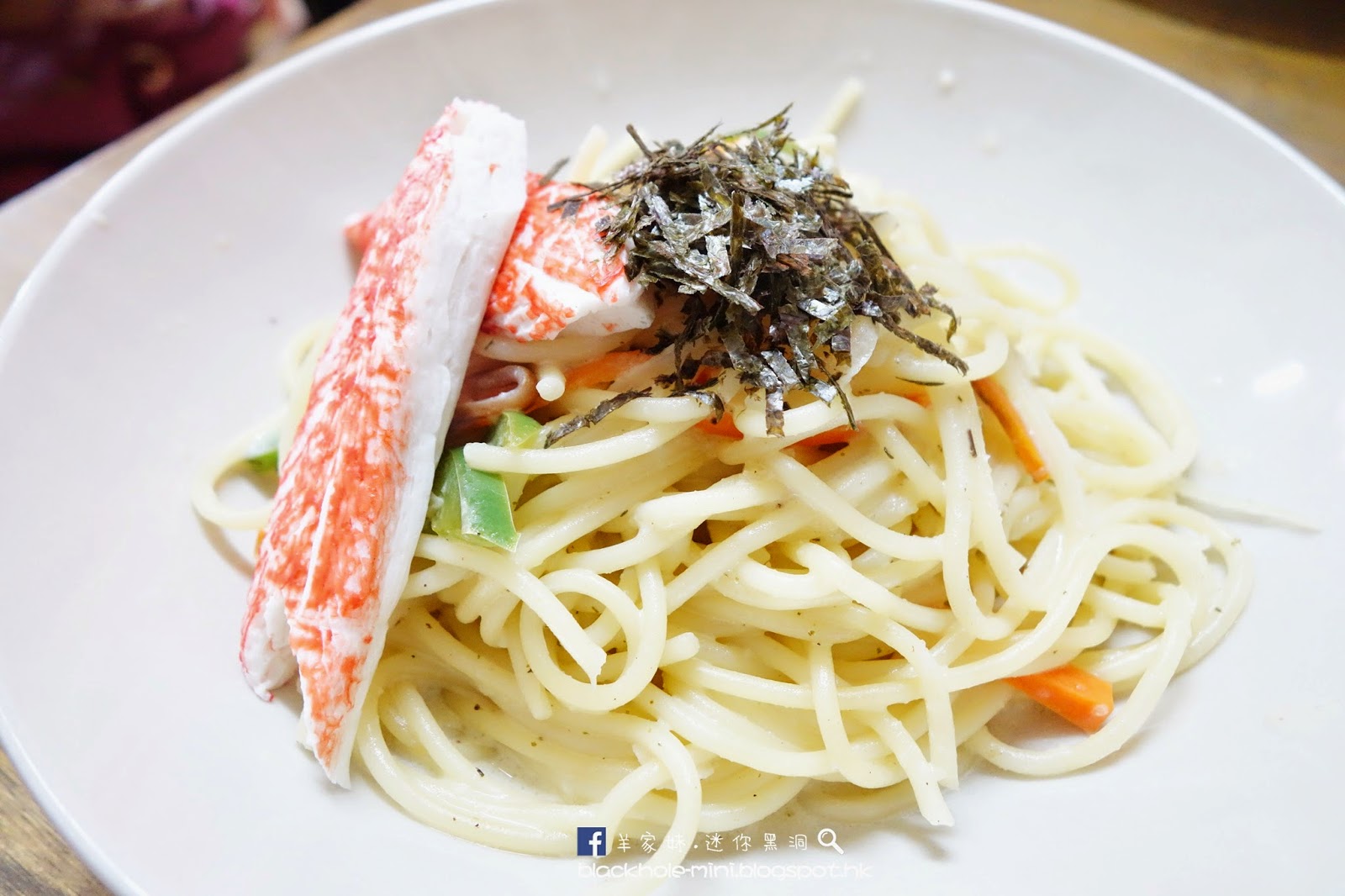 蟹棒忌廉意粉。蟹棒的顏色有點詭異,遠看有一種膠膠的感覺,還好味道就是一般的仿蟹柳。意粉整體略淡,沒什麼忌廉味,我要額外再加點辣椒仔才覺得好一些。
