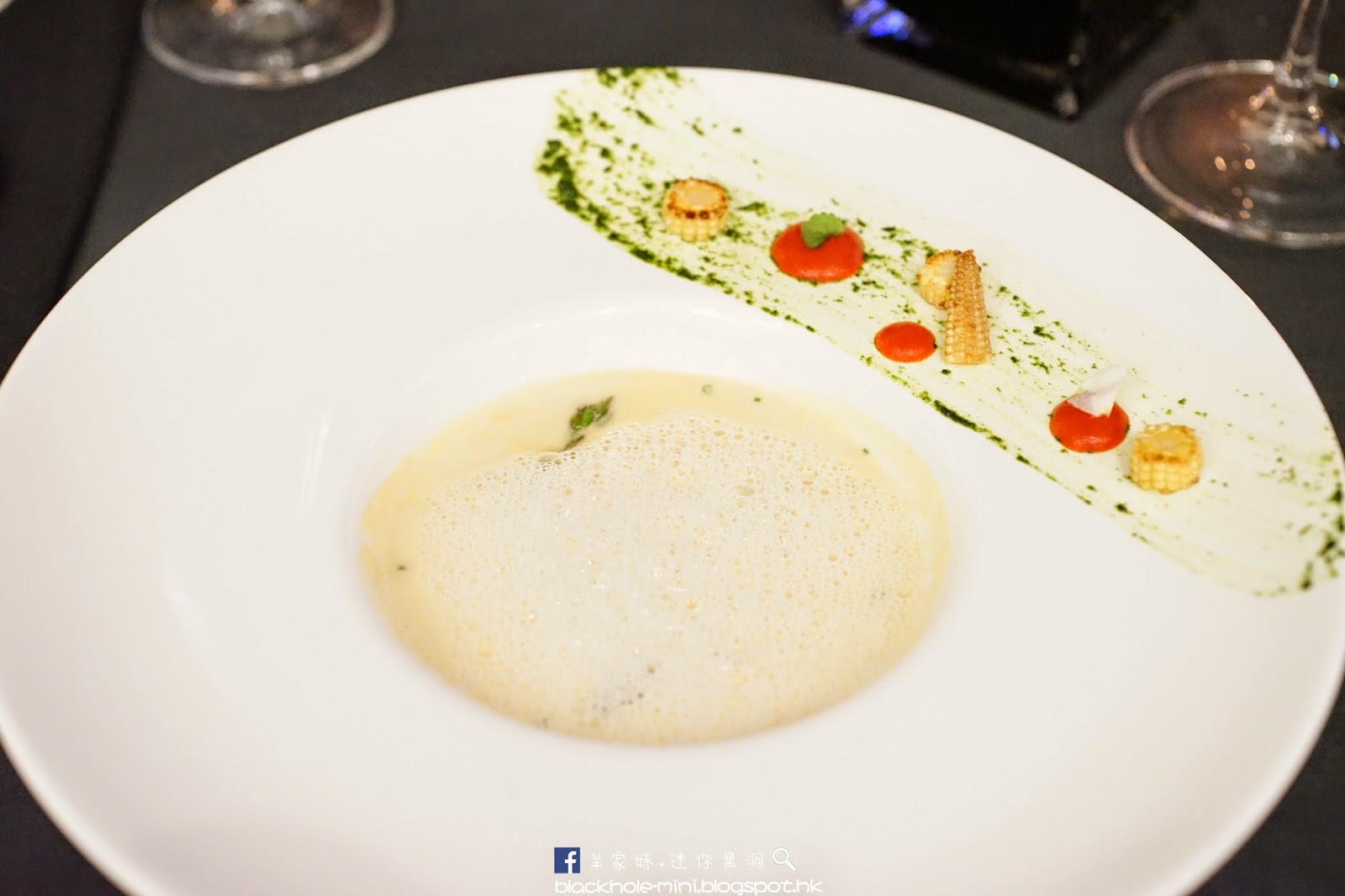 Orange Ginger Corn Soup, Piquillo Puree, Baby Corn。味道有特別的粟米湯,忌廉味重,口感幼滑,橙味和薑味也不突出,把紅椒Puree混合在湯內,味道更豐富。