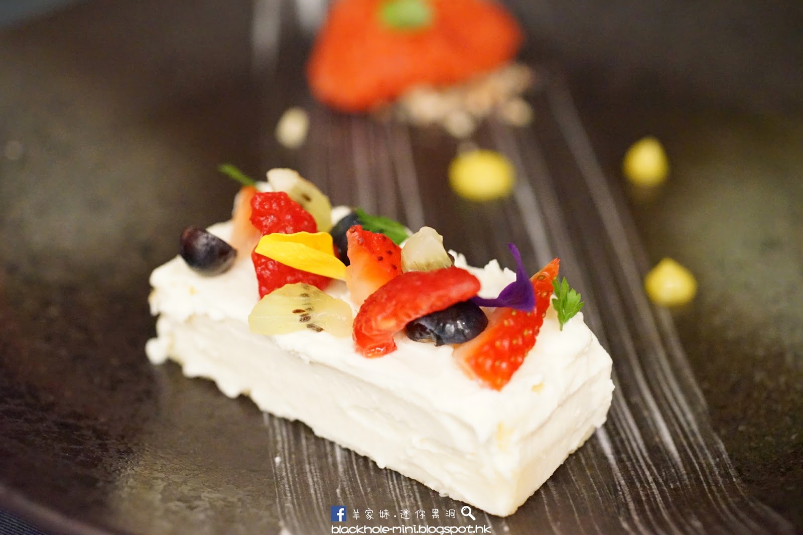 Chiffon Cake, Mixed Fresh Berries, Lemon Cream, Strawberry Sorbet。 Strawberry Sorbet很refreshing,但略嫌碎冰有點多。Chiffon Cake鋪滿色彩繽紛的雜果和花瓣,很漂亮,口感有點扎實,鬆軟一點的話更好。