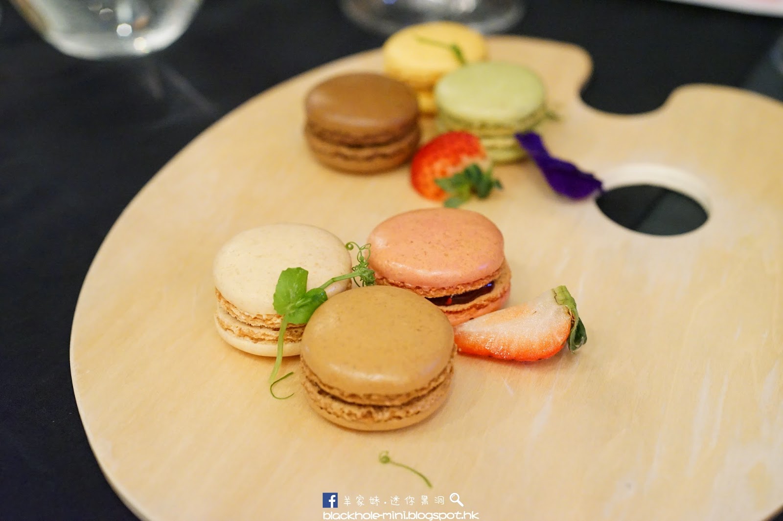 最後侍應送來一塊調色木盤,上面放著六款不同口味的馬卡龍,小巧可愛,不過因為太飽所以沒吃,不過身邊的人卻一口接著一口吃了大半。