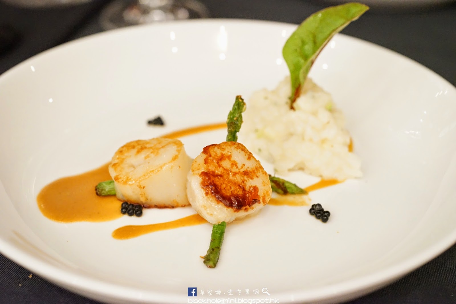 Seared Scallop, Lobster Cream, Asparagus Risotto, Truffle Oil Cavier。煎香的帶子中間夾著一條小露筍,帶子很鮮味,露筍爽脆,併湊起來有雙重口感。旁邊的露筍意大利飯對我來說有點硬,但味道是不錯的。Chicken Roll with Savoy Cabbage and squid Ink Noodle, Season Vegetable, Chestnut Puree, Cream Parmesan Foam, Chicken Jus。用上拆肉的春雞肉包著椰菜,雞肉很,與椰菜一起吃感覺不會太漏,再佐以栗子蓉醬,甚有水準的主菜。另外自家製的墨魚意粉,意粉幼得有如Angel Hair,但口感很彈牙,有點像中式幼麵,如果忌廉芝士汁多一點就更好了。
