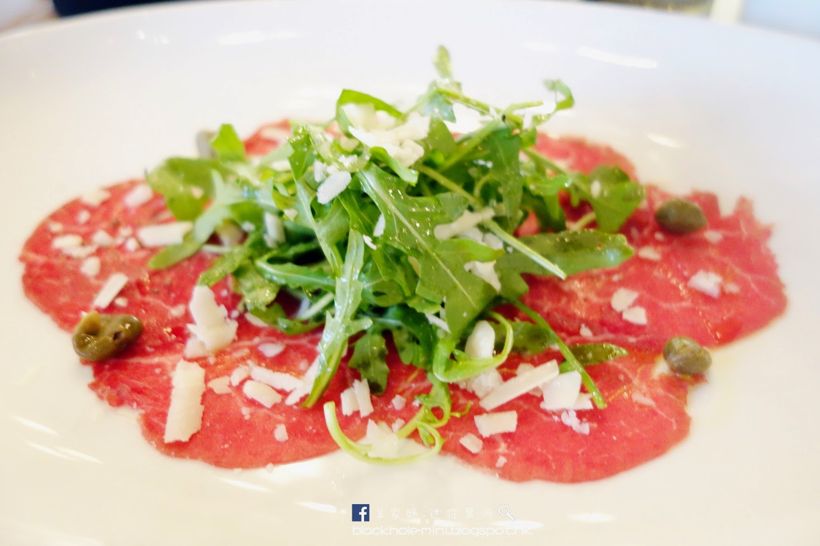 薄切牛柳片伴火箭菜及巴馬臣芝士。Carpaccio是非常著名的意大利頭盤,薄切牛柳片的肉通常會比較淡,所以配搭濃味的巴馬臣芝士和新鮮的火箭菜,味道層次就更豐富。