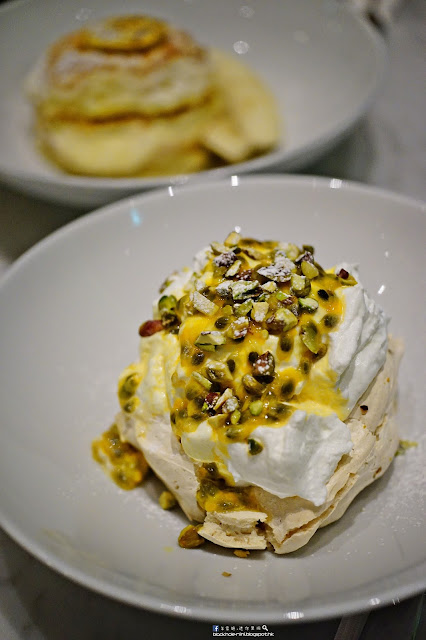 餐牌的選擇不算多,如果早上來的話會供應早餐,但宵夜時段只吃得下甜品而已。點了一份Ricotta Cheese Pancake之外,額外加了客Pistachio Passion Fruit Pavlova。