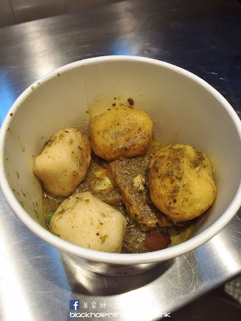 另外亦點了香咖喱魚蛋,香咖喱驟眼看似綠咖喱,但其實是加了香茅的咖喱,所以會帶點綠色。魚蛋有白魚蛋、炸魚蛋、魚片和豆角,聞起來是很香,但吃著又覺得不像傳統馬來咖喱般香濃。