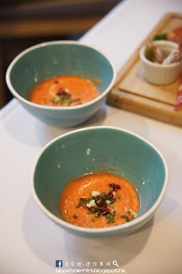 酥炸西班牙小青椒油潤光亮,鹹香惹味送酒一流;傳統蕃茄凍湯加了少許火腿乾作點綴,清新之中帶點鹹香。