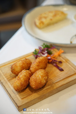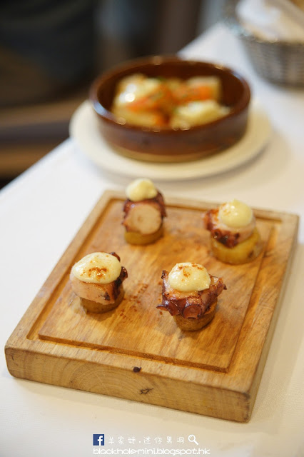 傳統西班牙辣汁馬鈴薯是今日的薯類菜之一,西班牙人會因地區而有不同做法,這次主廚的是加泰隆尼亞煮法,把薯仔水煮至半熟再炸,最後配上辣茄醬和蒜蓉蛋黃醬而成;另外一開始還以為火腿雞肉炸薯丸是炸蟹餅,原來是加入了高級西班牙火腿再炸,薯丸炸得香脆不油;再來是下面的傳統西班牙洋蔥薯仔奄列,是經典的西班牙菜,雖然吃後非常飽肚但也叫人吃不停。烤西班牙八爪魚伴甜椒蒜蓉蛋黃醬是大創的自創Tapas,手指薯配香木燒八爪魚再加上甜椒蒜蓉蛋黃醬,口感與味道層次都有夠豐富。
