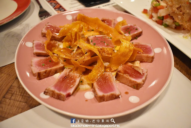 Marinated Red tuna tataki with dry tomato mayonnaise的吞拿魚四邊已微微烤過,但中間仍保留粉嫰顏色,加上炸脆片和帶微酸的醬汁便完成,吞拿魚本身嫩滑又有點焦香,而跟點微酸醬汁同吃更可將原本的鮮味帶出。