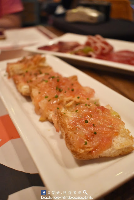 晚餐開始前先來杯無酒精的清新Mango Mojito,喜歡喝酒的也沒問題,這裡亦供應不少特色cocktail,當然也少不了西班牙Sangria。 Jamon Iberico Con Pan De Cristal當中包括幾款西班牙火腿和芝士,其實三款火腿都不錯,入口有油香,另外配上的蕃茄多士既脆口又帶蕃茄酸味,加上面層鋪滿酸甜的車厘茄後更開胃。