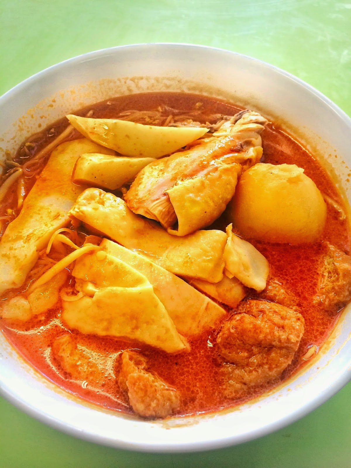 一碗亞王咖喱雞麵,SGD5,(匯率,SGD1兌HK5.6),相比下,湯稍為沒那麼濃香,辣度也少一點,但仍有濃郁的椰香,辣中帶甜,豆卜跟薯仔都好吃,喜歡薯仔又腍又入味。而亞王的咖喱雞肉質嫩腍得多,再添些辣醬吃更惹味。