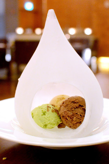 最後甜品有Ice Drop,VND150,000,在水滴型的冰內放著三球雪糕,一邊吃雪糕都不怕會溶。還有開心果布甸及蘋果金寶,喜歡開心果布甸,味道又濃又香,質感又稠滑。再遇法藉大廚,一嚐他的法式佳餚,在河內開心的一夜。