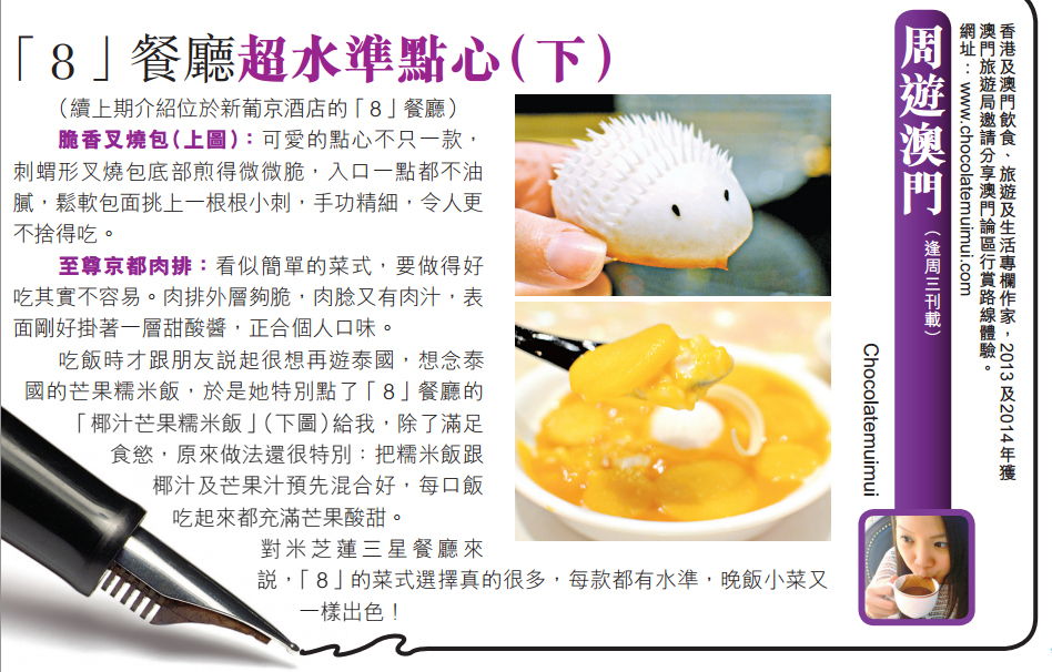 今個星期澳門力報寫飲食專欄「周遊澳門」繼續介紹澳我最愛的澳門米芝蓮三星中餐廳,位於新葡京的「8」。